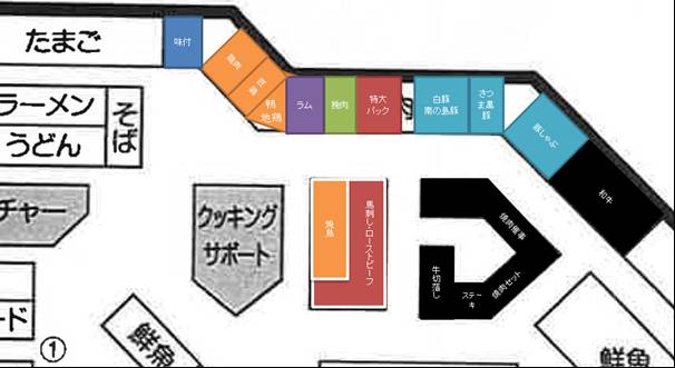 定番の直線的な精肉コーナーではなく、カクカクした客導線は、必然的に売場にマグネットが出来る。マグネットとなる場所には必ず、キーとなるブランド商品が陳列されていたことが印象的である。客導線に沿って、各コーナーブランド商品⇒定番アイテムの順に陳列されているのは基本に忠実であるが、トラディショナル売場に見えないのがヤオコーマジックである。